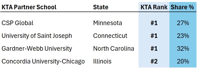 With its diverse number of universities across the country, KTA has 3 other partners who ranked high their respective states. In all, KTA has 7 of its 16 partners that ranked in the top 5 for market share.